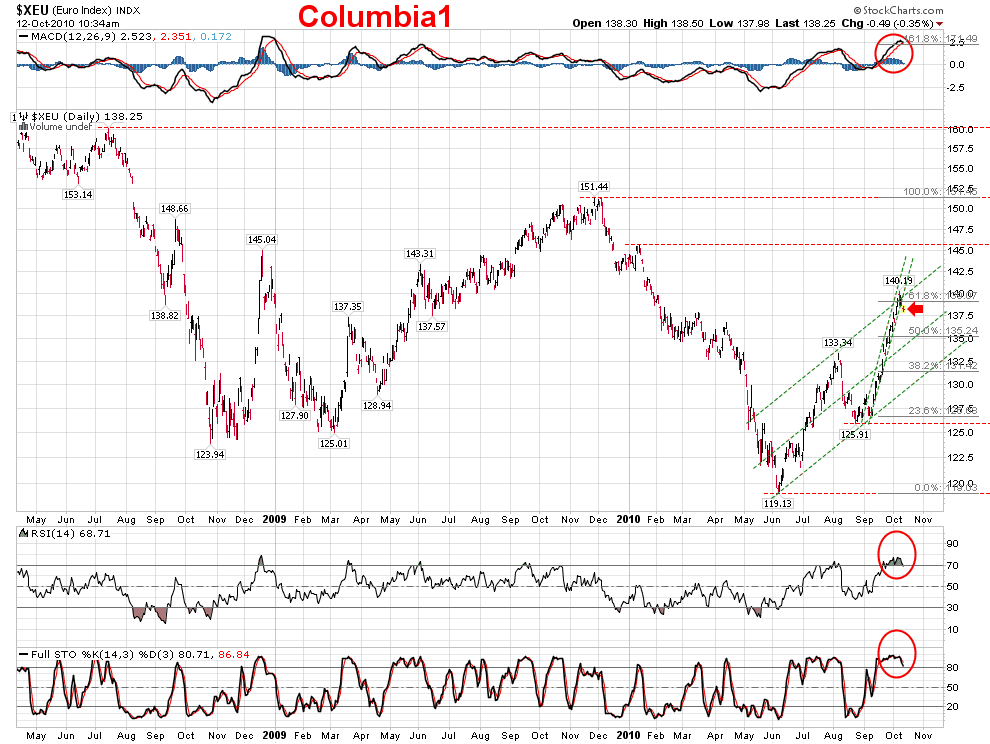 7:37, There are signs that the Euro could be breaking down, which would be bullish for the Dollar, and bearish for the equities market. The indicators which are in extreme over-bought territory are in the process of rolling over to a sell, and there was a break below the short-term channel line this morning.